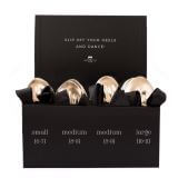 20 pairs of Rescue Flats each wrapped with a satin ribbon: 5 Small, 10 Medium, 5 Large. Plus 20 high heel bags!